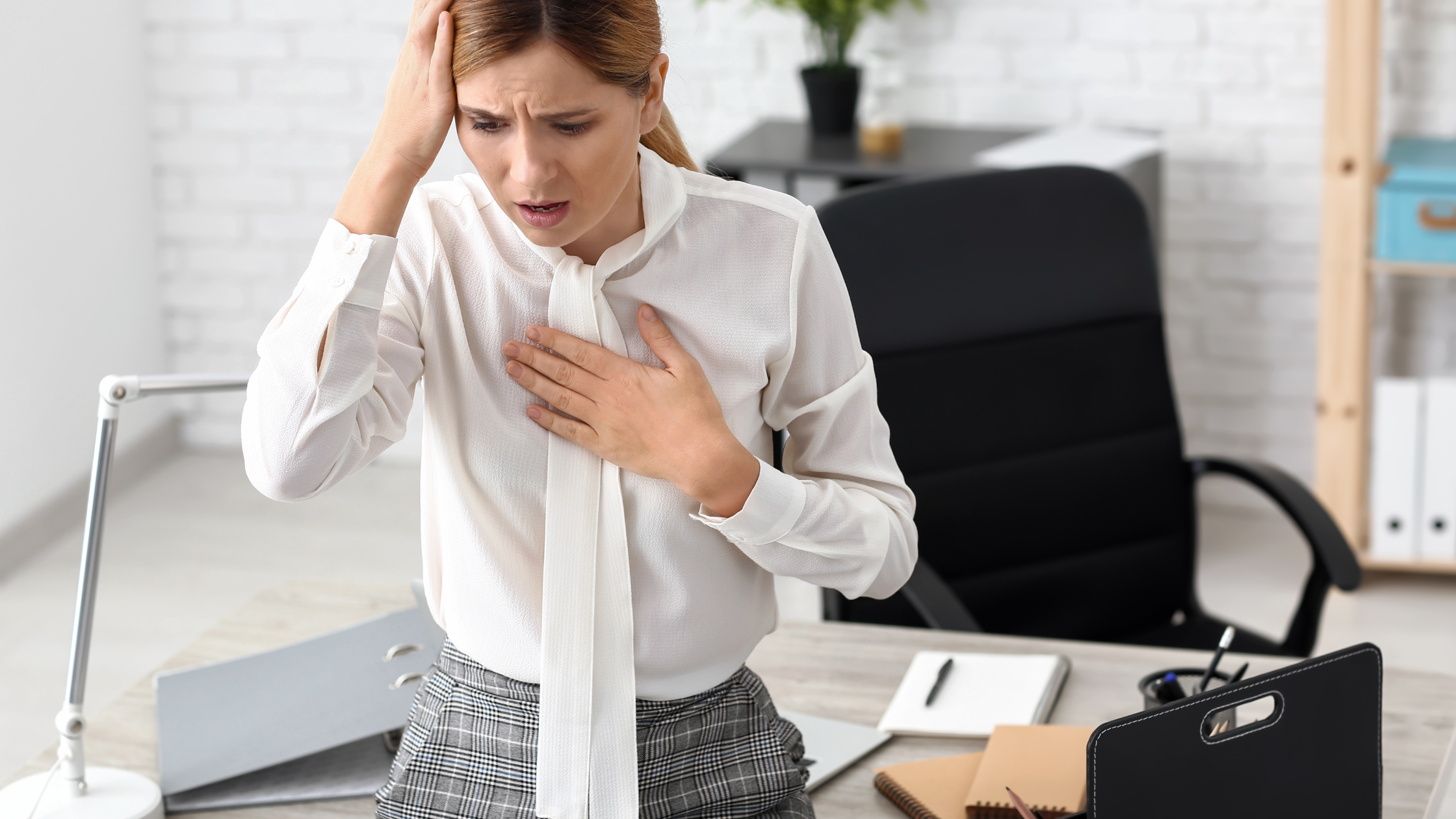 A woman holding her chest and head, looking distressed in an office, indicating she may be experiencing chest pain or a heart attack.